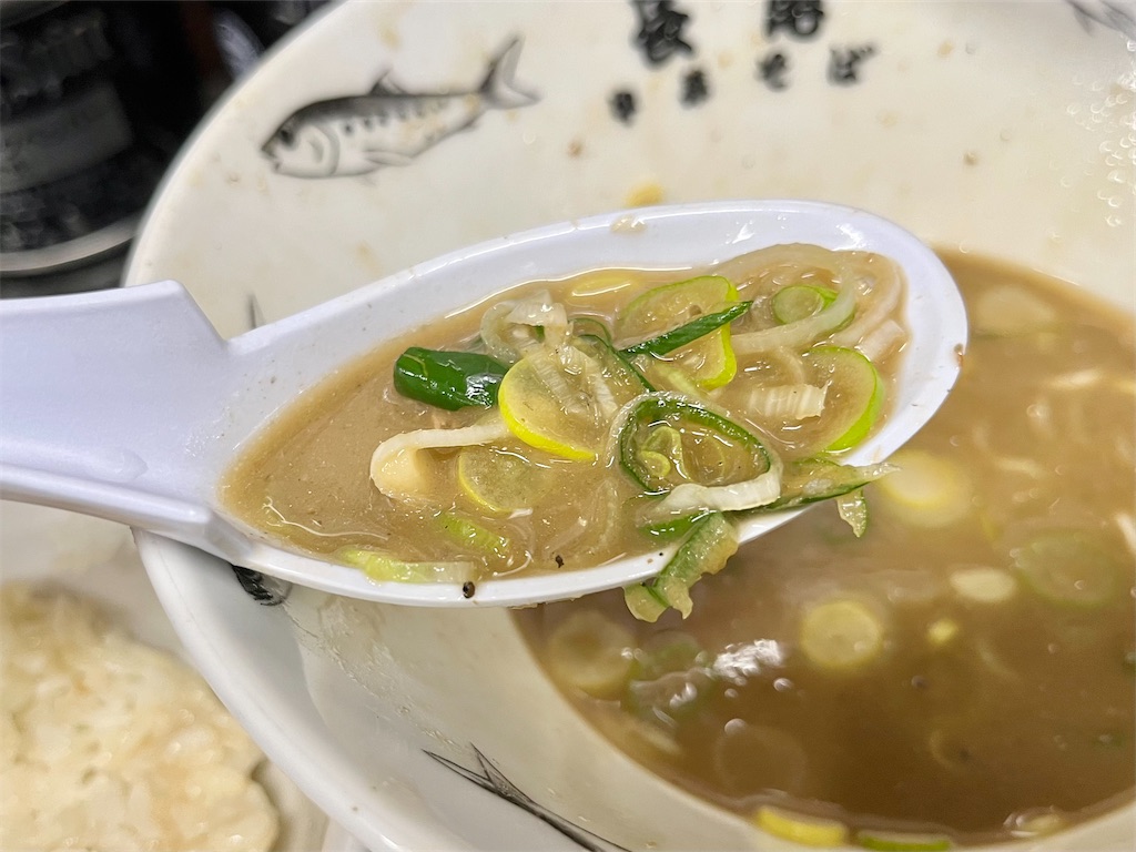 濃厚な煮干しと動物系のスープに浸したネギは、オイラ大好き🤗