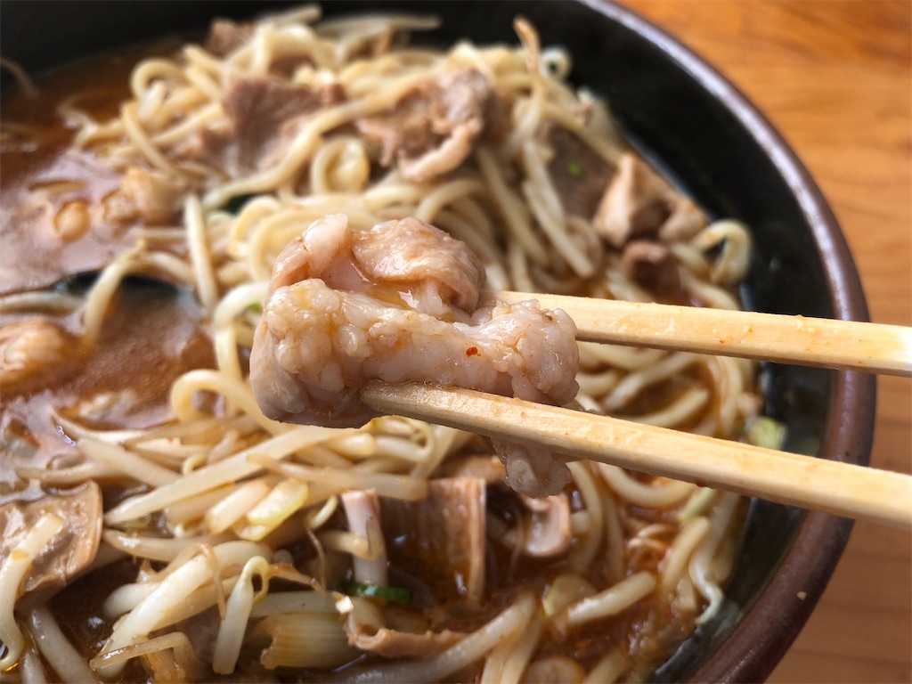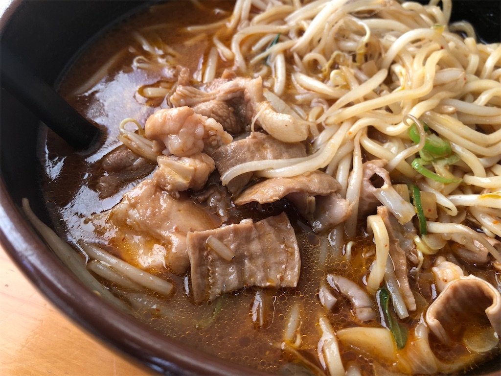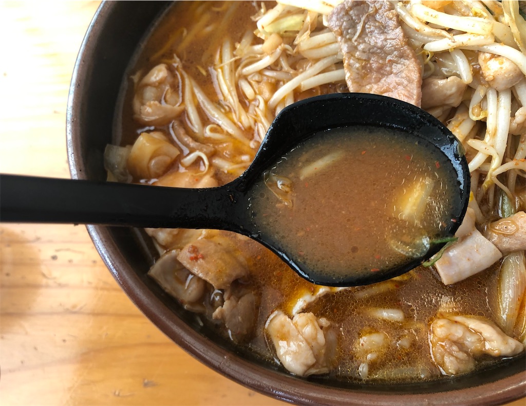 見た目とは対照的に?辛さは控えめ。甘辛の焼肉のタレに何かを加えて、ラーメンと合うようにしたように思われるスープ。