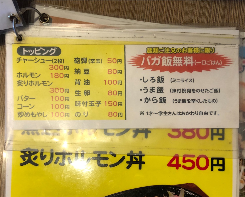 写真右側、「バガ飯無料(一口ごはん)」。